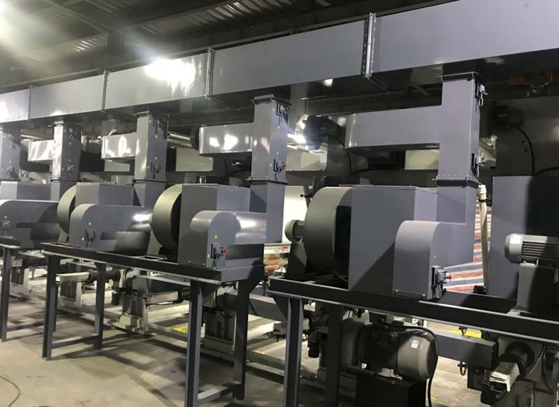 8.干燥、冷卻結(jié)構(gòu):烘箱采用離心機(jī)吹吸,電熱管分布在每組烘箱的吹風(fēng)口進(jìn)行加熱,烘箱內(nèi)部形成風(fēng)量熱循環(huán),溫度由智能溫控儀控制,回頭輥用水冷卻式,確保薄膜降溫。循環(huán)再回收風(fēng),特點(diǎn):節(jié)省用電。