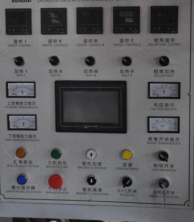 本機適用于各類塑料薄膜,紙張,鋁箔等卷筒狀材料的兩層或多層復合。該機采用德國西門子PLC可編程序控制系統、臺灣威倫彩色觸摸屏人機操作界面。運用現場總線網絡實現生產過程全自動控制。PLC負責整機張力,速度等數據的輸入及預處理,并負責整機邏輯的控制與輸出。涂膠與復合兩大部分的速度同步及張力配置全數字式交流變頻控制系統(變頻電機+日本安川變頻器),實現張力全自動控制。